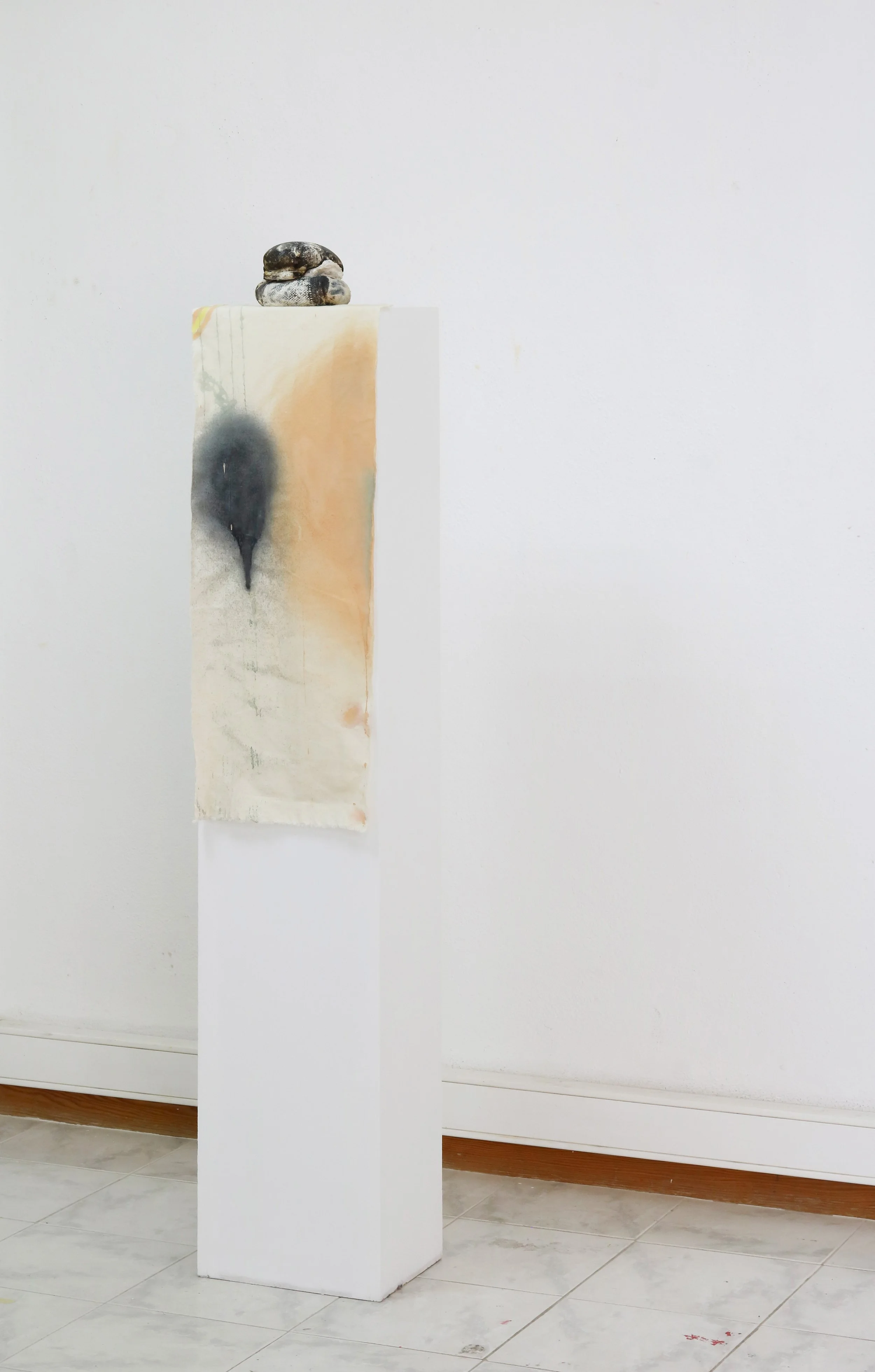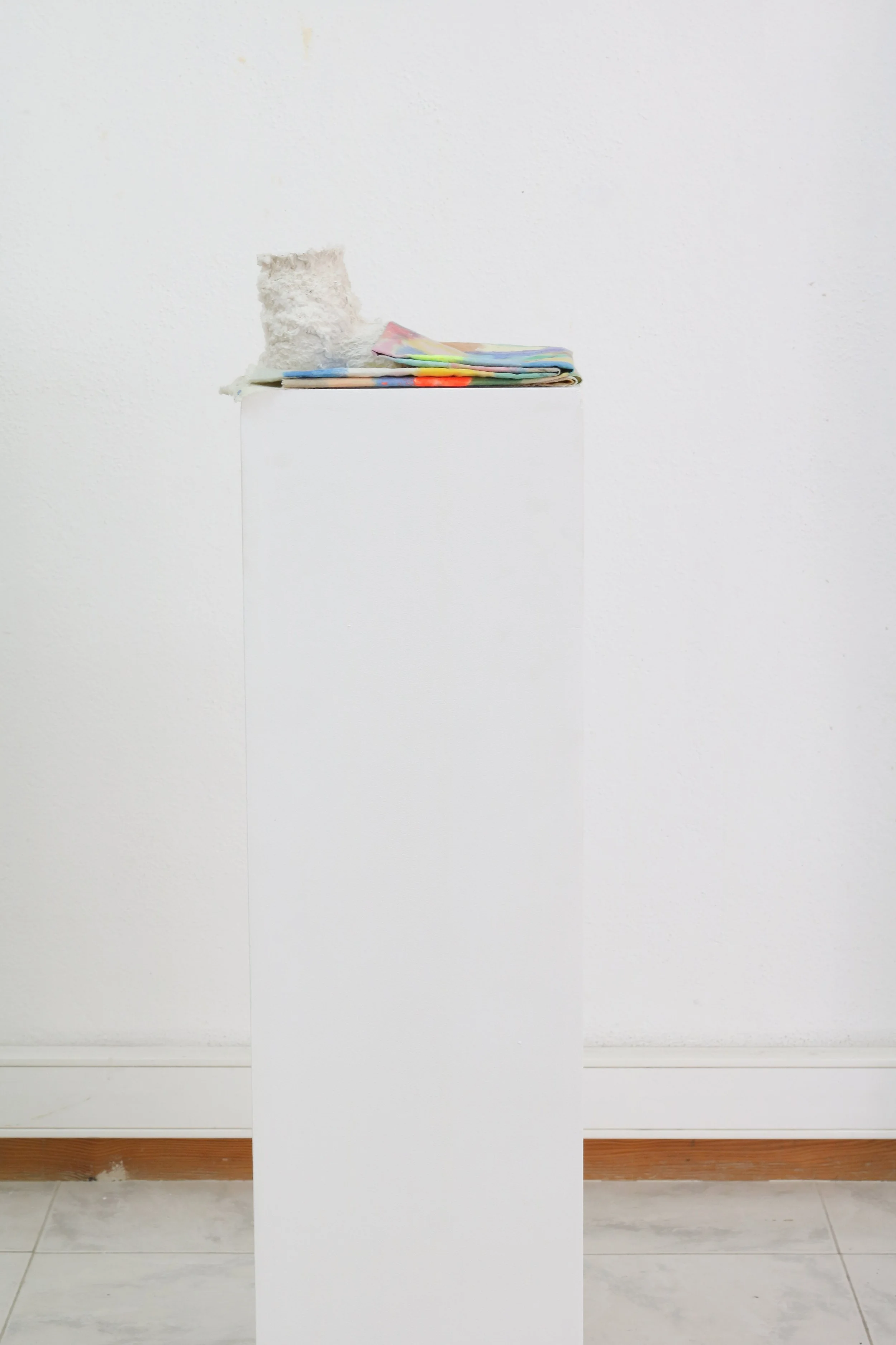 Cimento, tecido, pano cru, tinta acrílica e plinto em madeira